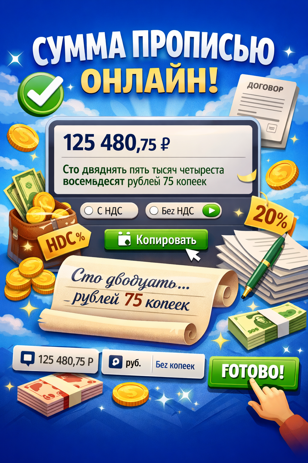 Введите сумму цифрами и получите 3 формата для копирования. При необходимости включите использование НДС и выберите вариант формулировки.